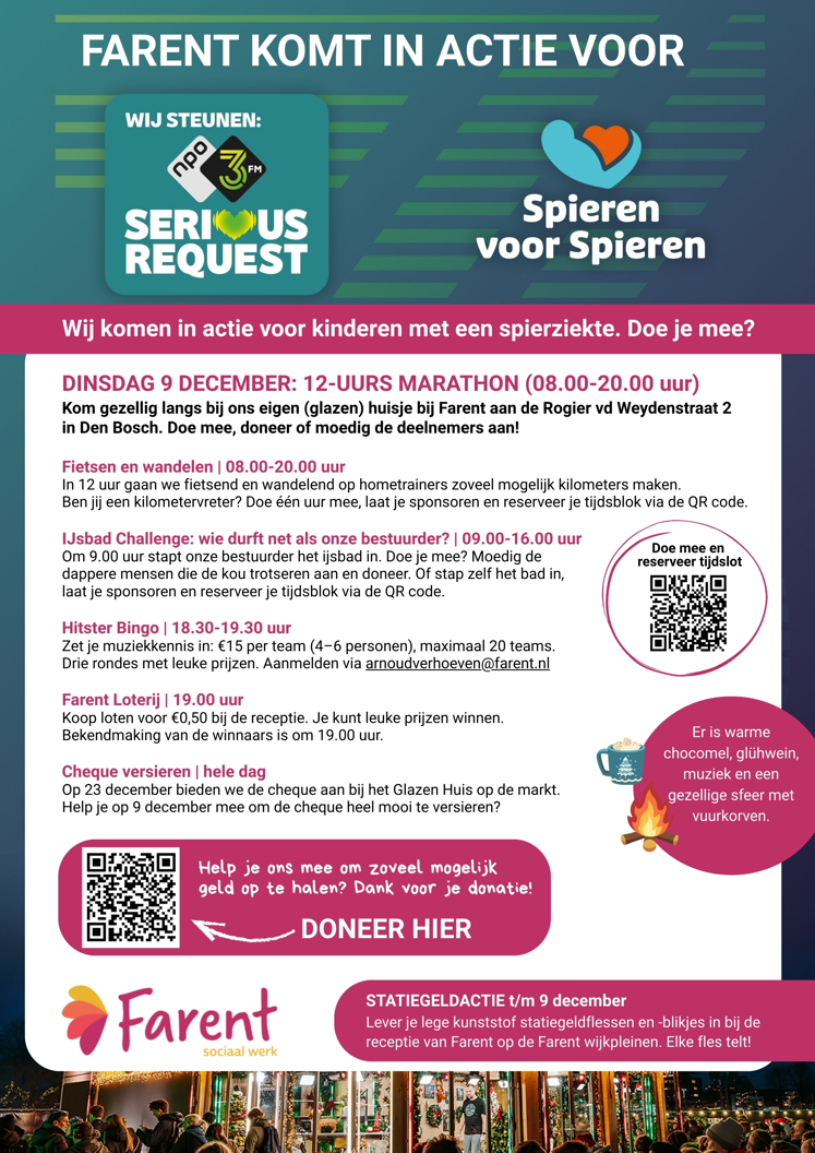 Op dinsdag 9 december zetten we ons van 8.00 tot 20.00 uur actief in voor Serious Request! Fiets of wandel een uur de kilometers in je benen, duik net als onze bestuurder in het ijsbad, speel mee met de Hitster Bingo of kom deelnemers aanmoedigen bij ons eigen Glazen Huisje op het parkeerterrein van Farent aan de Rogier van der Weydenstraat 2, 's-Hertogenbosch.